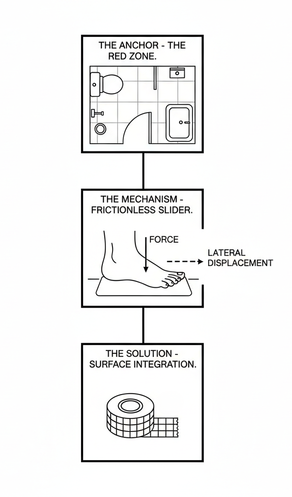 When a senior "walks carefully" (short, shuffling steps), they are unconsciously trying to lower their RCOF. However, a loose rug on a smooth tile drops the ACOF to near zero. No amount of careful walking can compensate for a floor that provides zero friction.